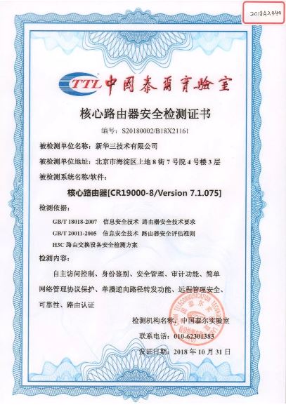 新華三CR19000-8核心路由器獲得泰爾系統(tǒng)實(shí)驗室首張網(wǎng)絡(luò)設(shè)備安全檢測證書